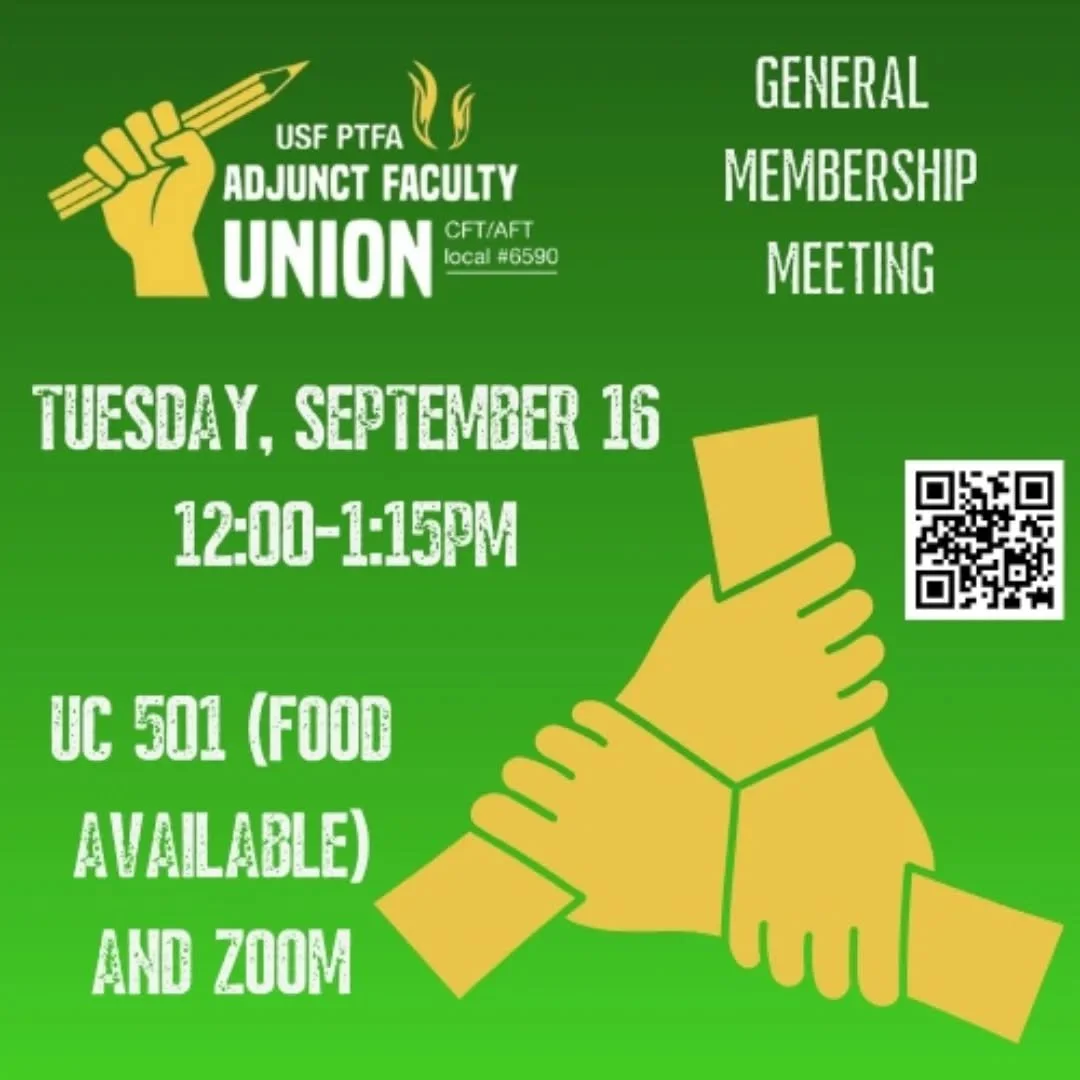 **Note: the union does not represent adjunct faculty at the USF Law School, nor full time USF staff who are teaching a course outside of their regular duties. If you have a question about whether or not you are in our bargaining unit, ask officers [at] usfptfa.org or check your paystub to see if union dues have been deducted